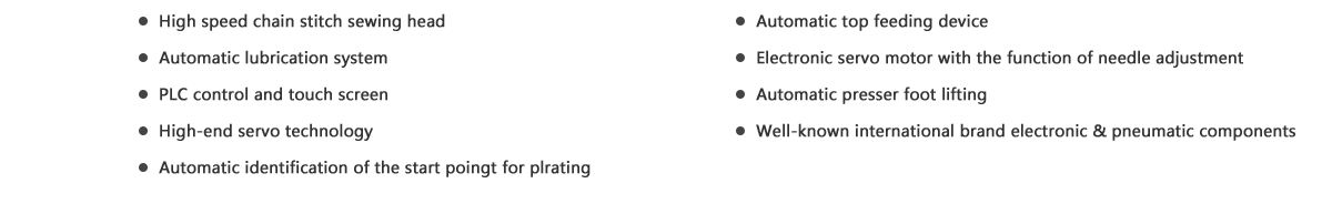 It is used for pleating at the four corners of the pillow-top-mattress border. The number of pleats, the number of stitches when pleating, and etc. can be set according to demands. Compared with the traditional manual process, this system can enhance the production efficiency greatly and make the mattress to be with higher level, and additional value.